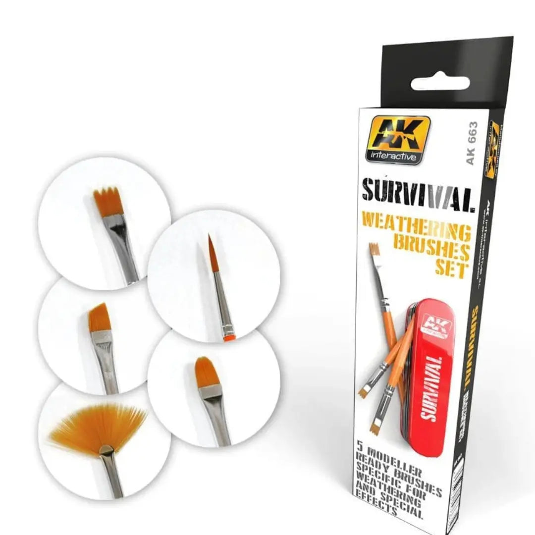 Survival Kit (all of the above)An arsenal of brushes designed by the weathering experts here at AK. Top quality weathering products require the right tools to be applied; our Survival Weathering Brush set is the right set of tools you need. Contained in this set are the brushes needed to streak, chip, wash, and apply pigments plus much more.