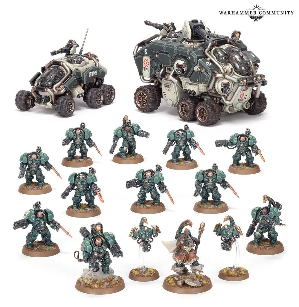 Harness the wisdom of the Votann and the steely judgement of the Leagues with the versatile forces in this boxed set. A doughty Einhyr Champion leads an armoured fist of Einhyr Hearthguard, packing a massive punch as they're delivered to battle by a Hekaton Land Fortress. A fast-moving Sagitaur ATV lays down suppressing fire with advanced weaponry, while a wise Grimnyr provides psychic support.