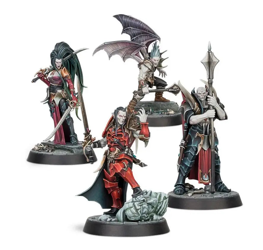 This multipart plastic kit builds the Crimson Court – a band of bloodthirsty Soulblight vampires, led by Prince Duvalle. This group of unique characters is packed with personality and detail – Prince Duvalle is clad in sinister and ornate armour, his noble features twisted into a fanged sneer as he poses atop a fallen statue, while his three companions are armed with their own weapons – blades and bludgeons bloodied through centuries of battle.